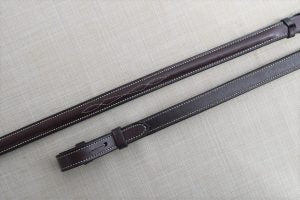 Black Oak 5/8″ Round Raised Fancy Laced Reins with white stitching.