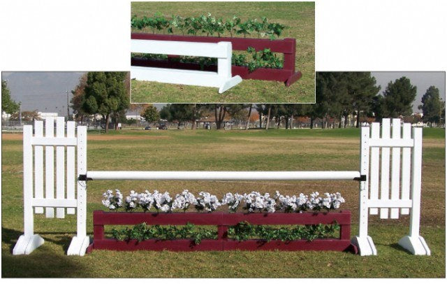 The traditional design of this free standing brush box creates an attractive way to fill any jump. With the realistic look of wood but lightweight mobility, this brush box is an important accessory for any course. The top rail is 18" high, and if you add flowers or greens to the top rail it is about 24" to the top of the flowers.
