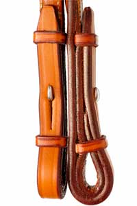 Plain raised reins to match all Edgewood fancy stitch bridles. Edgewood strap goods are renowned for their fine attention to detail, including, hand finished edges, and lovely stitching. All in the famous deep chestnut color Edgewood is immediately recognizable for 5/8'' or 1/2" wide. Hook with stud end closures.