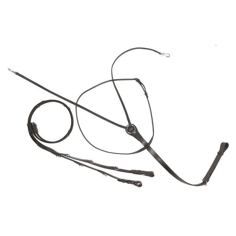 The Harborough reins, also called Thiedemann combination is a combination of a martingale with extended fork ends and web reins with 3 sewn semicircular rings. The reins is a variant of draFull reins with the difference that the coming out of the bridle reins ring is locked to the bridle reins. The rider holds so despite the auxiliary rein only reins straight into the arms, and the maximum length of neck is directly dependent on the reins length. The position at which the Harborough reins are hooked into the bridle, decides on the overall sharpness of the auxiliary rein. So even hotter horses for a certain period with this reins can be better regulated. The Kavalkade -Harborough reins has a perfect fit, is made of high quality leather and with enormous durability and functionality. Moreover Kavalkade uses only the best quality for a fair and reasonable price.