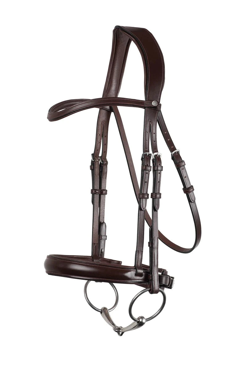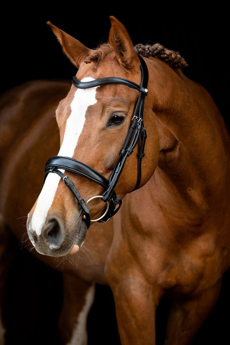 Classic and ergonomic bridle made in Montar leather with stainless steel buckles. Normandie’s open neckpiece lets the bridle adjust to the unique shape of every horse. Thanks to the V-gap and the soft padding at the sides, the neck can move freely for each step and lets even the most sensitive horse relax and focus on following rider directions. Special for the noseband is the detachable flash strap. The loop can be completely removed, by pushing it between the padding and top leather. This gives you the possibility to switch between using the bridle with or without the flash noseband whenever you feel like it - of course without compromising the perfect classic look. The noseband has a pullback closing with a softly padded cushion to protect the jawbones. The classic browband has soft padding and an elegant curve to highlight the expression of the horse. All Montar browbands are easy to remove and can be changed even when the bridle is in use. All outer loops are lined with rubber, so you never have to bother with loose straps while riding. Reins are sold separately. Approved for use in FEI Jumping, Dressage and Eventing competitions.