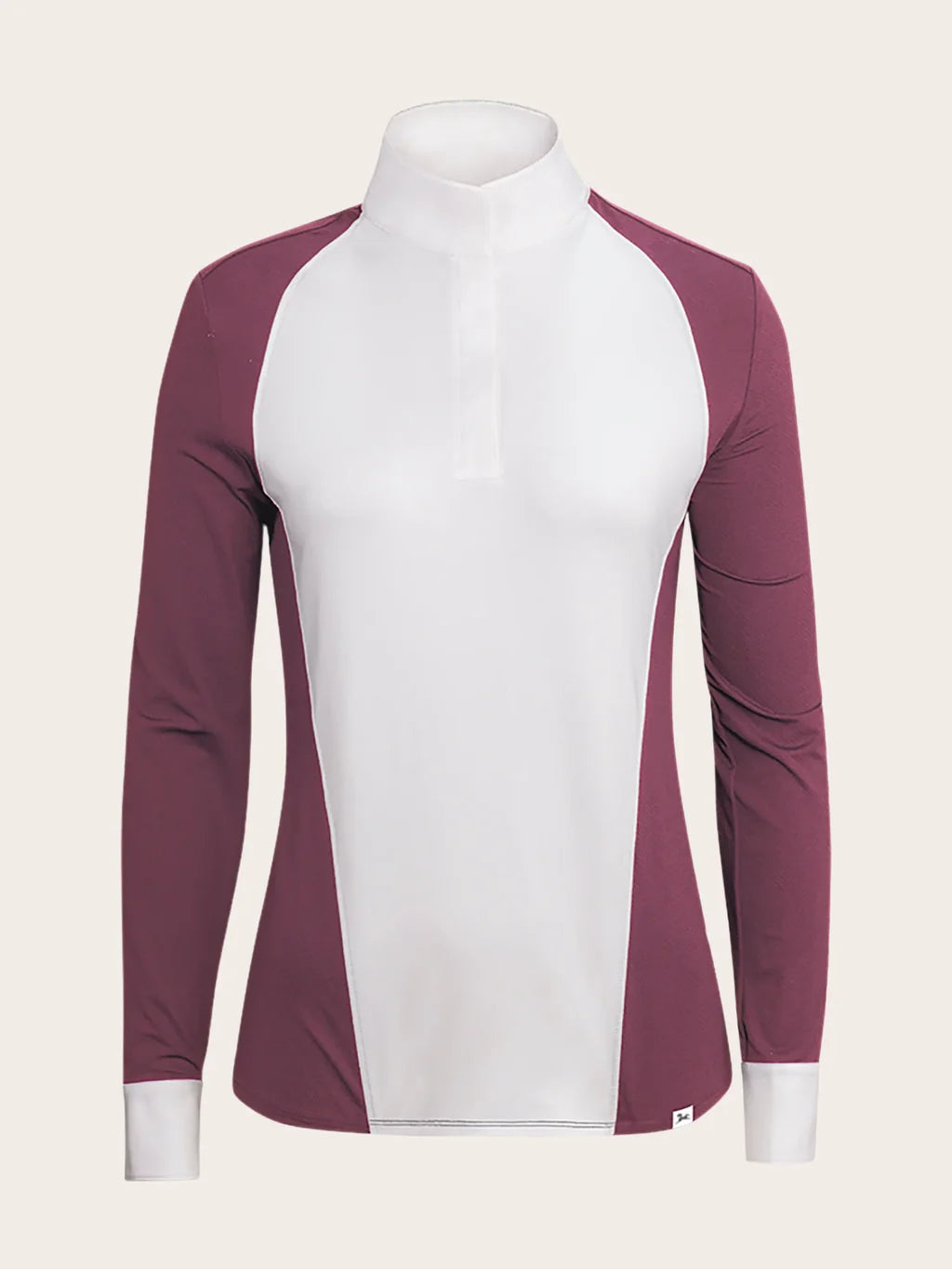 The Lexi show shirt brings a modern, sporty twist to your show clothing wardrobe. The white front panel combined with the textured body in vibrant colors offers perfect styling both in and out of the show ring. Updated seam lines, R.J. logo details, and a zipper placket complete this fresh new style. The fabric provides both wicking features and UPF protection, ensuring you feel your best during the heat of the competition!