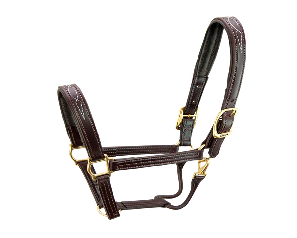 It is hard to find a more beautiful halter then our Signature Halter! Made of 1" wide English Bridle Leather then padded with soft, colored garment leather and completed with white fancy stitching centered on the crown and nose. The halter comes with a straight chin and snap at the throatlatch and Solid Brass or Stainless Steel hardware. Customize with a nameplate for a one of a kind look!