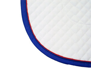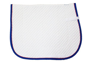 A square small diamond quilted pad with a white cotton broadcloth top. It's quilted over 1/2" foam and a poly fiber fill with 100% cotton flannel against the horse. Girth Strap included.